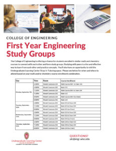 The College of Engineering is offering a chance for students enrolled in similar math and chemistry courses to connect with each other and form study groups. Studying with peers is a fun and effective way to learn from each other and practice concepts. You’ll also have an opportunity to visit the Undergraduate Learning Center Drop-in Tutoring space. Please see below for when and where to attend based on your math and/or chemistry course enrollment combination.